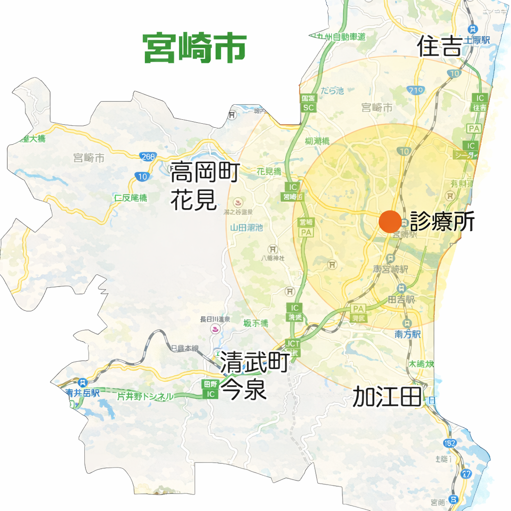 訪問可能エリア診療所からおよ30分以内の地域が対象となります。(診療所より10km程度)※30分を超える場所にお住まいの方も対応できる場合がございますのでご相談下さいませ。